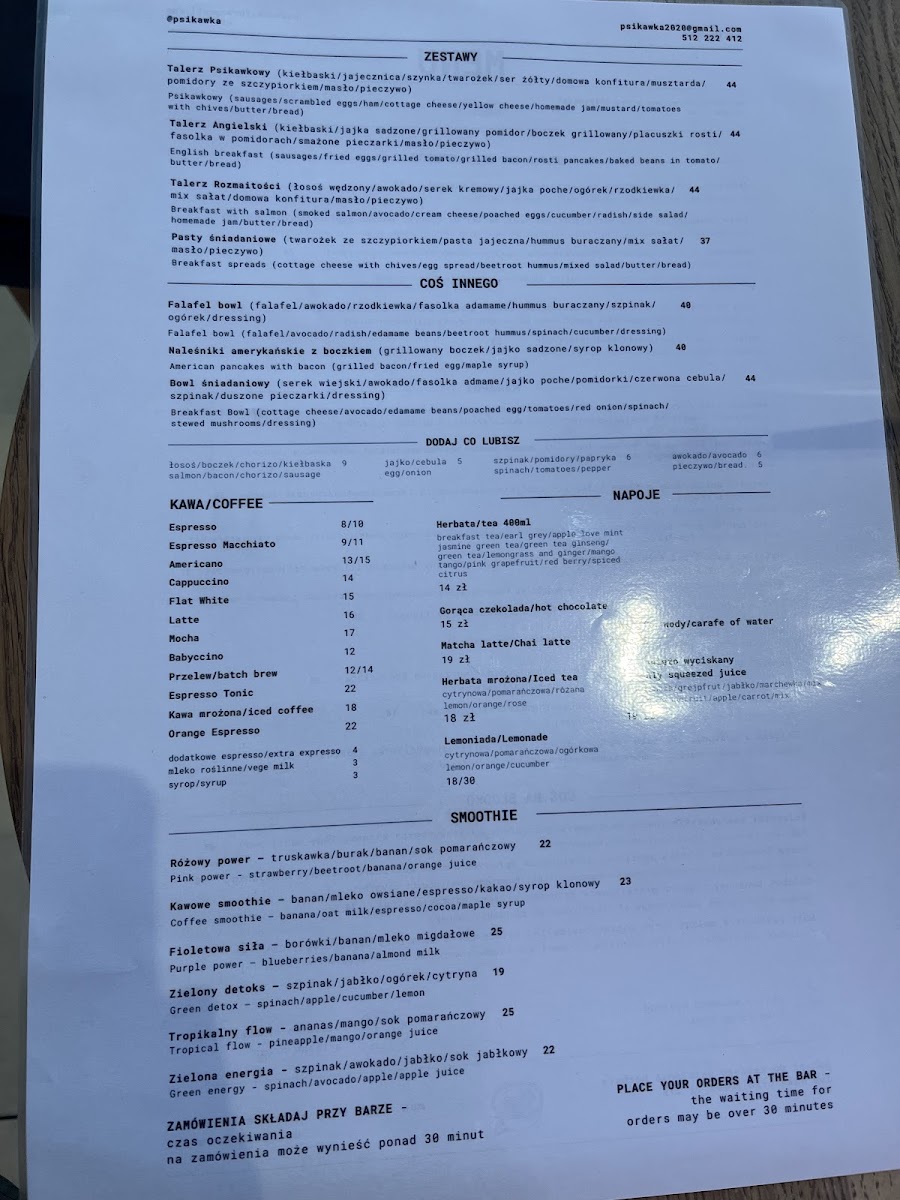 Psikawka - Psia Kawiarnia Menu